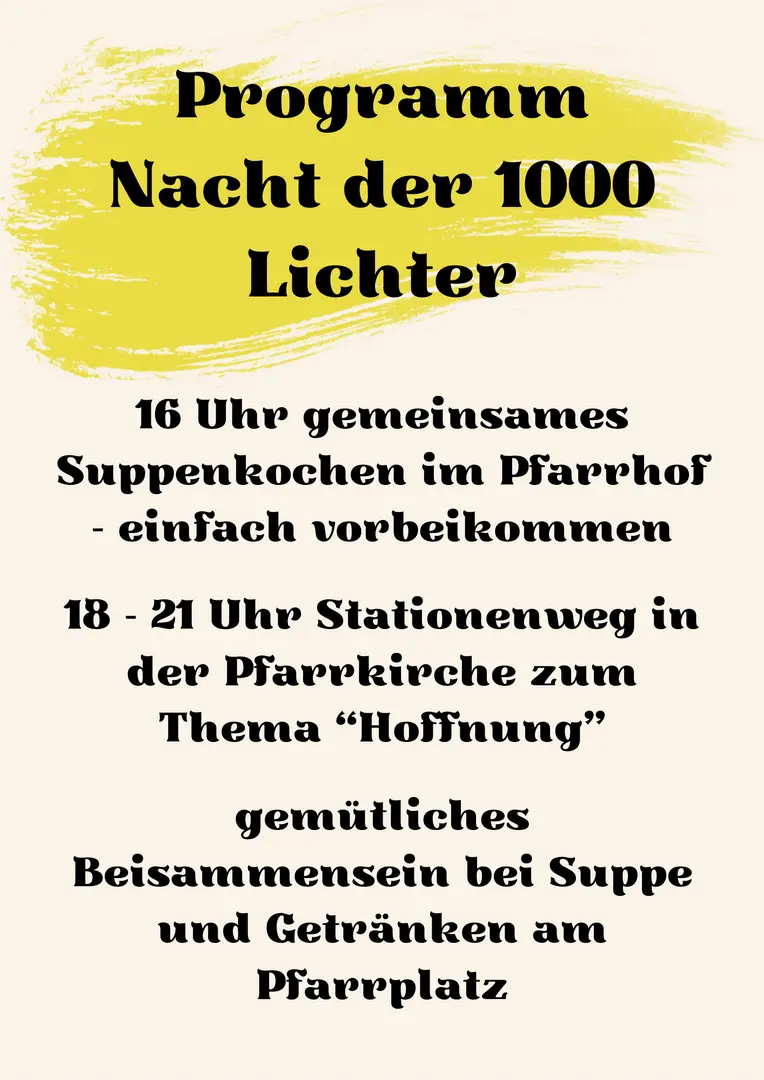 In der Pfarre Zell ist die diesjährigen Nacht der 1000 Lichter zum Thema “Hoffnung” gestaltet. An Stationen wird bei wohltuender Atmosphäre im Kerzenschein eingeladen, in verschiedenen Betrachtungsweisen auf “Hoffnung” zu blicken. Am Pfarrplatz werden Getränke und Suppe für ein gemütliches Beisammensein angeboten.